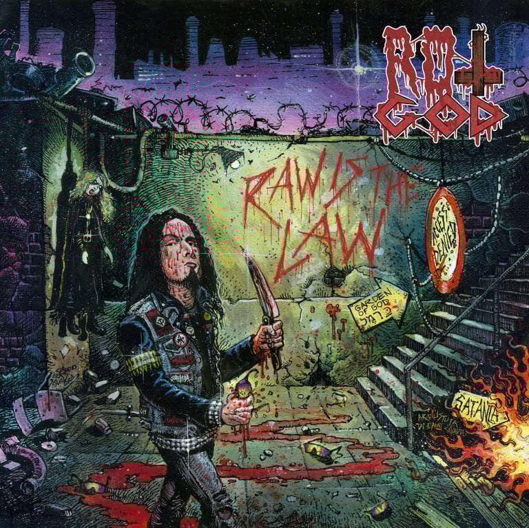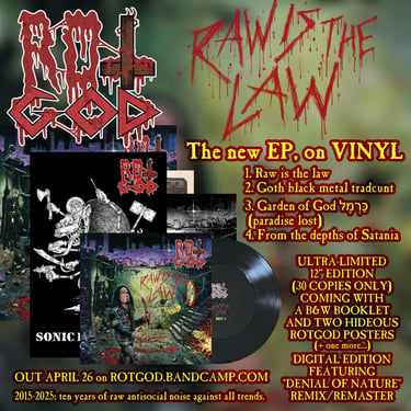 There couldn't be any better moment to finally release the aggressive and radical "Raw is the law" EP, recorded over the previous two years together with "Polemics and obscenity": a true sum of Rotgod's artistic/ideological manifesto, having always maintained its allegiance to 80's underground extreme metal, against any trends from the modern pseudo-underground "scene" - which are vehemently attacked in the title-track's lyrics (enhanced by a brilliant lyric video), together with the irreverent "Goth black metal tradcunt" making some rather mean-spirited fun of the so-called "romantic black metal" movement (represented by acts such as Këkht Aräkh, Draugveil and Sentiero dei Principi) and the kids forming its core fanbase.
